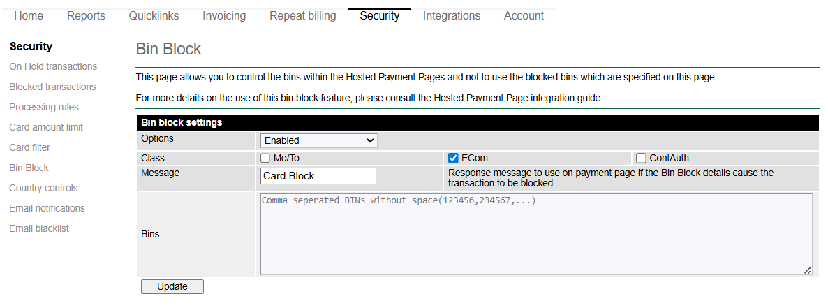 BIN Block feature allows you to block specific BINs (Bank Identification Numbers) from transaction processing. To activate this feature, go to the Security menu in the Merchant Admin System and select the BIN Block option (as shown in the screenshot below).