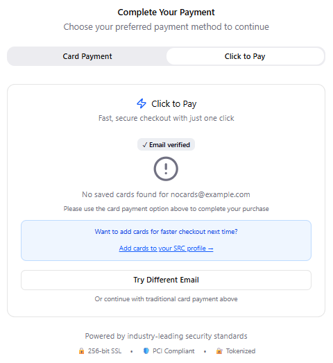 Display an information message to customers advising them to add or manage cards in their Click to Pay profile at www.src.mastercard.com/profile/ when no cards for listing, sample UI below: