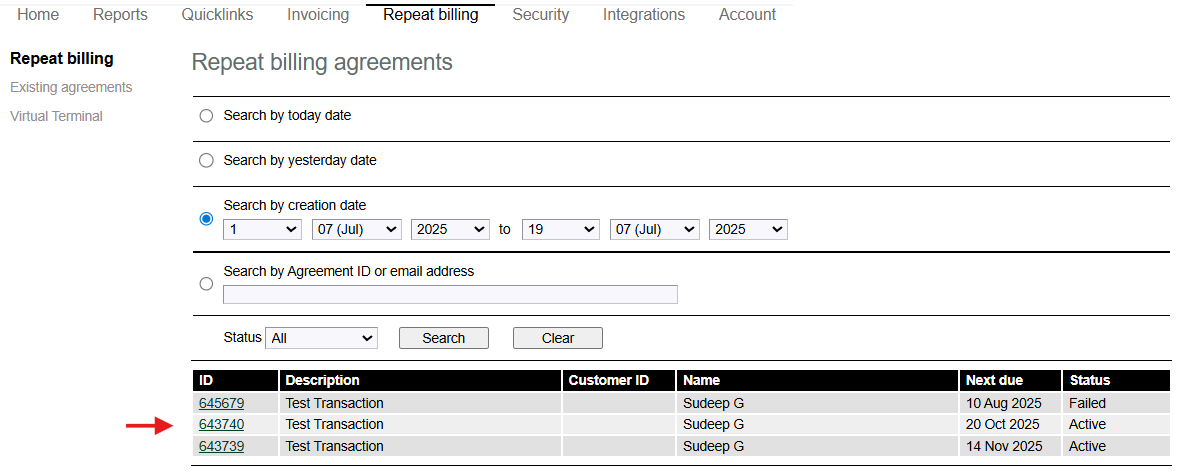 - Under repeat billing, search the agreement in which the card need to be replaced