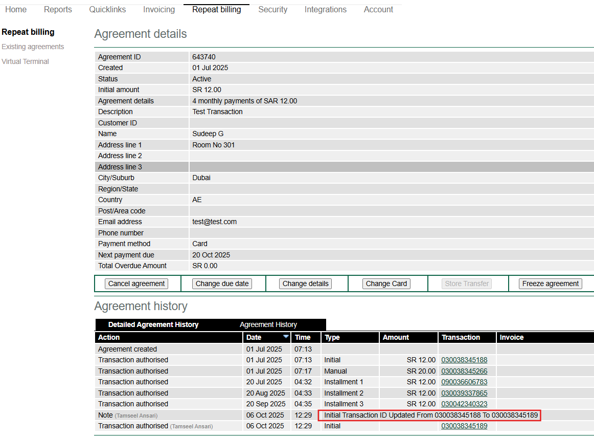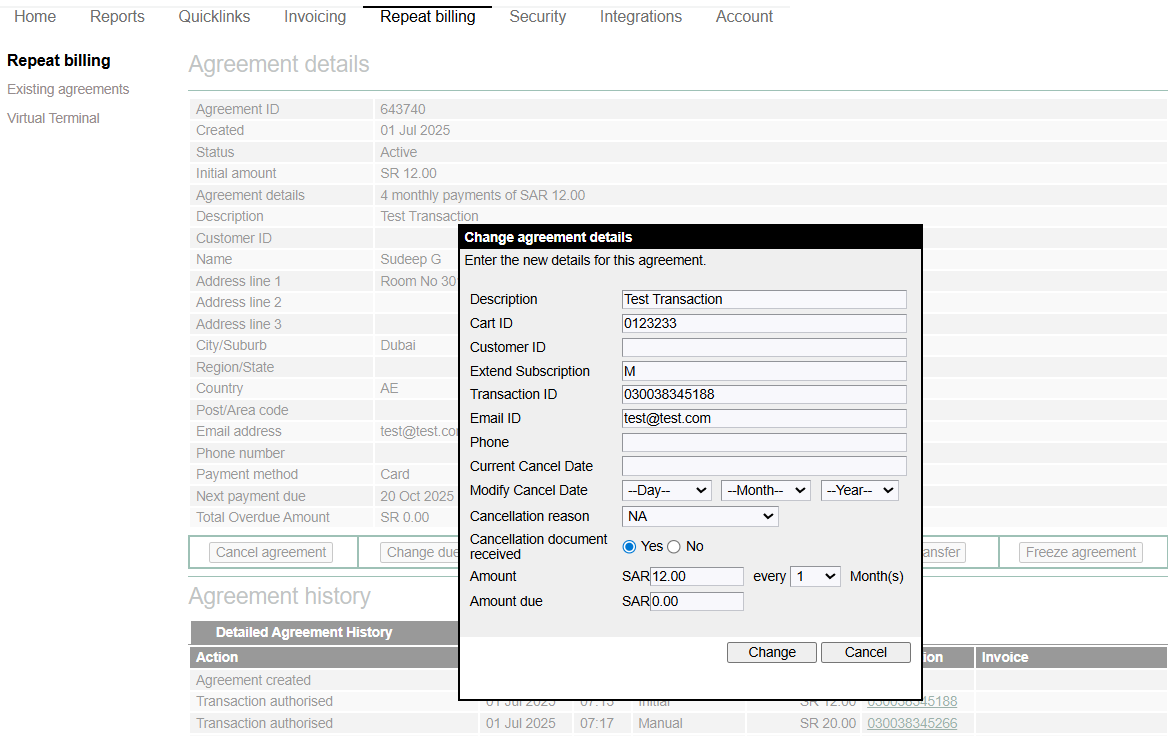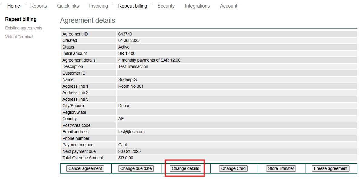 - After new transaction reference is updated in the agreements ‘change details’ tab, all the subsequent future recurring payment on that agreement will be charged from the card used in the new transaction.
