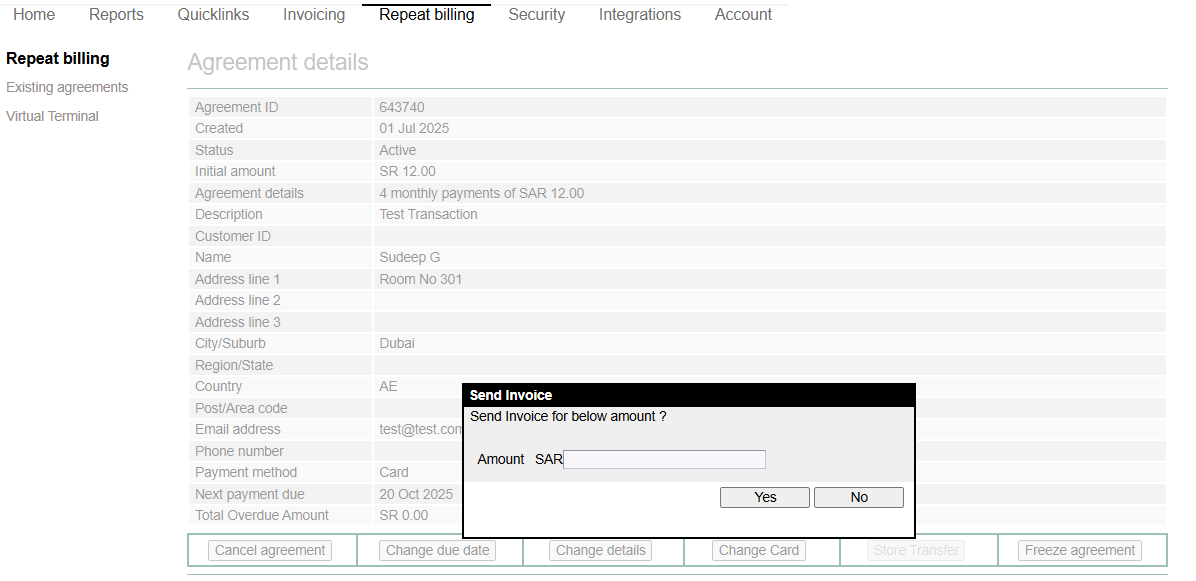- An invoice will be sent to the customer’s registered email address for this agreement. Once the customer completes the transaction using the new card, the updated card details will be automatically saved in the agreement.