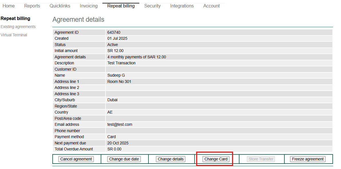 - Under Repeat Billing, search for the agreement where the card needs to be replaced. Open the agreement and click on Change Card.