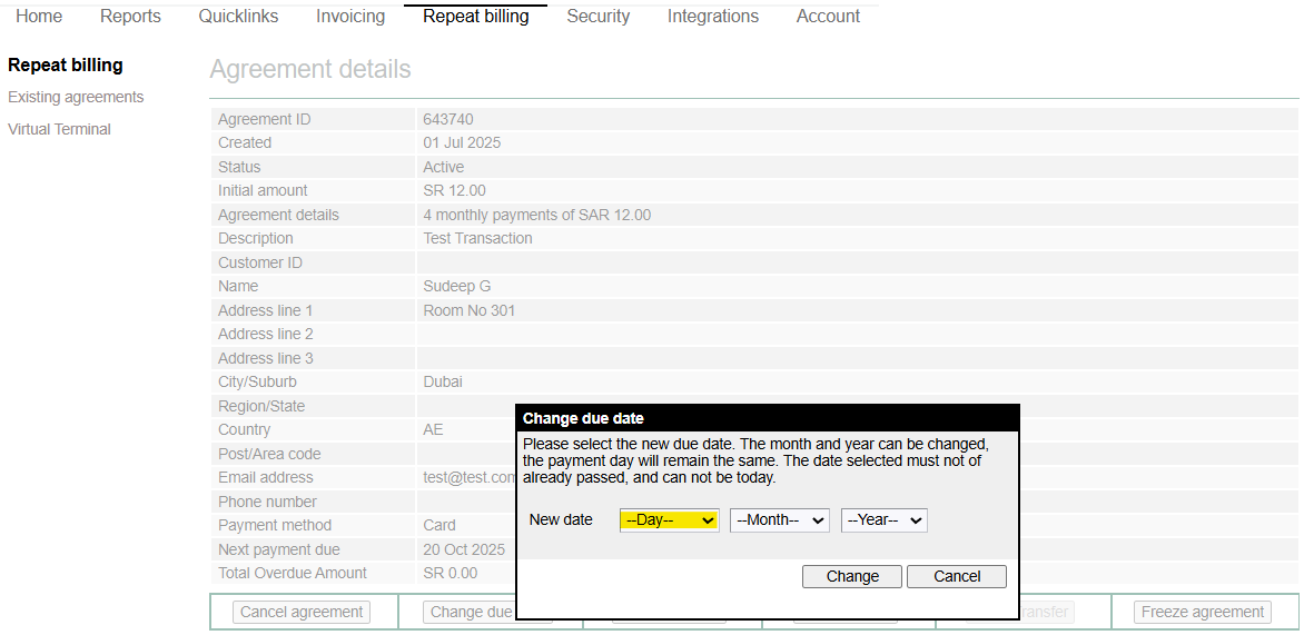 - Under change due date tab in the agreement, now you have an option to change the day of recurring payment