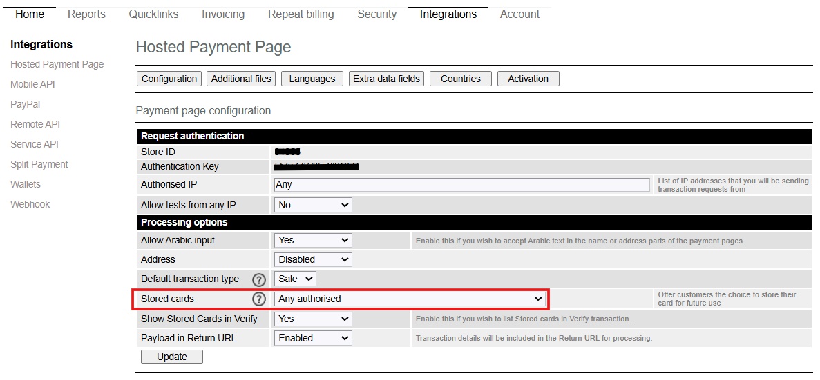 To enable the Stored card functionality, you first need to select the ‘Stored cards’ option within the payment page configuration in the Merchant Admin System (the page that shows your authentication key, please refer below screen shot). You then need to pass the parameter ‘bill_custref/"ref" containing the unique customer ID in the transaction request.